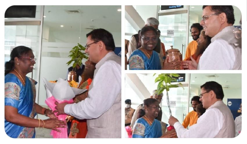आज 11 जुलाई 2022 को जौलीग्रांट एयरपोर्ट पर राष्ट्रीय जनतांत्रिक गठबंधन (NDA) की राष्ट्रपति पद की उम्मीदवार द्रौपदी मुर्मू का देवभूमि उत्तराखण्ड आगमन उत्तराखंड के मुख्यमंत्री पुष्कर सिंह धामी ने स्वागत एवं अभिनन्दन किया।